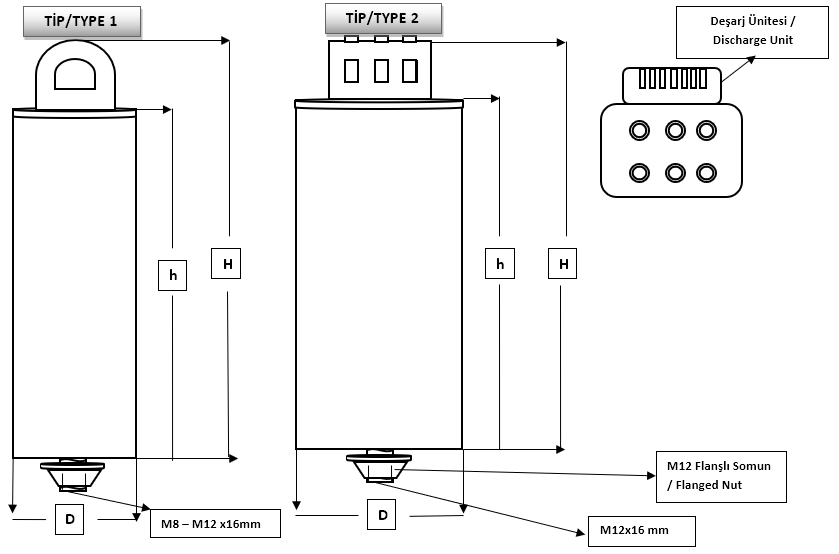 | GÜÇ/POWER ( kVAr ) | KAPASİTE/CAPACİTOR ( uF ) | AKIM/CURRENT ( A ) | TİP/TYPE | D (mm) | h ( mm ) | H ( mm ) |