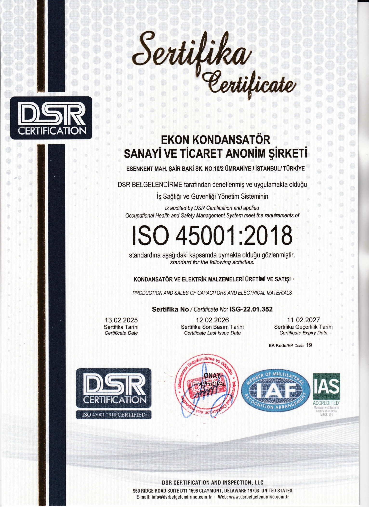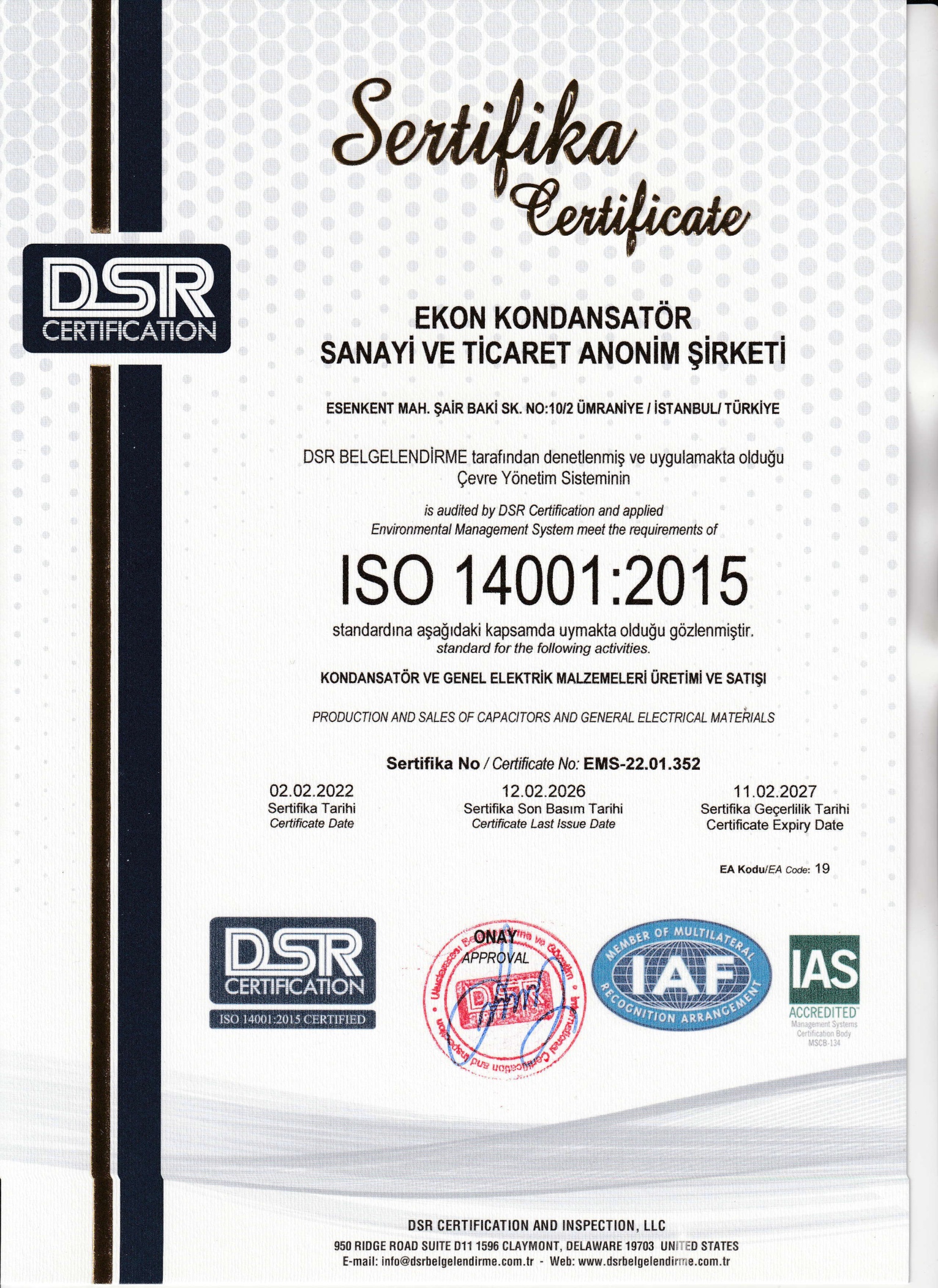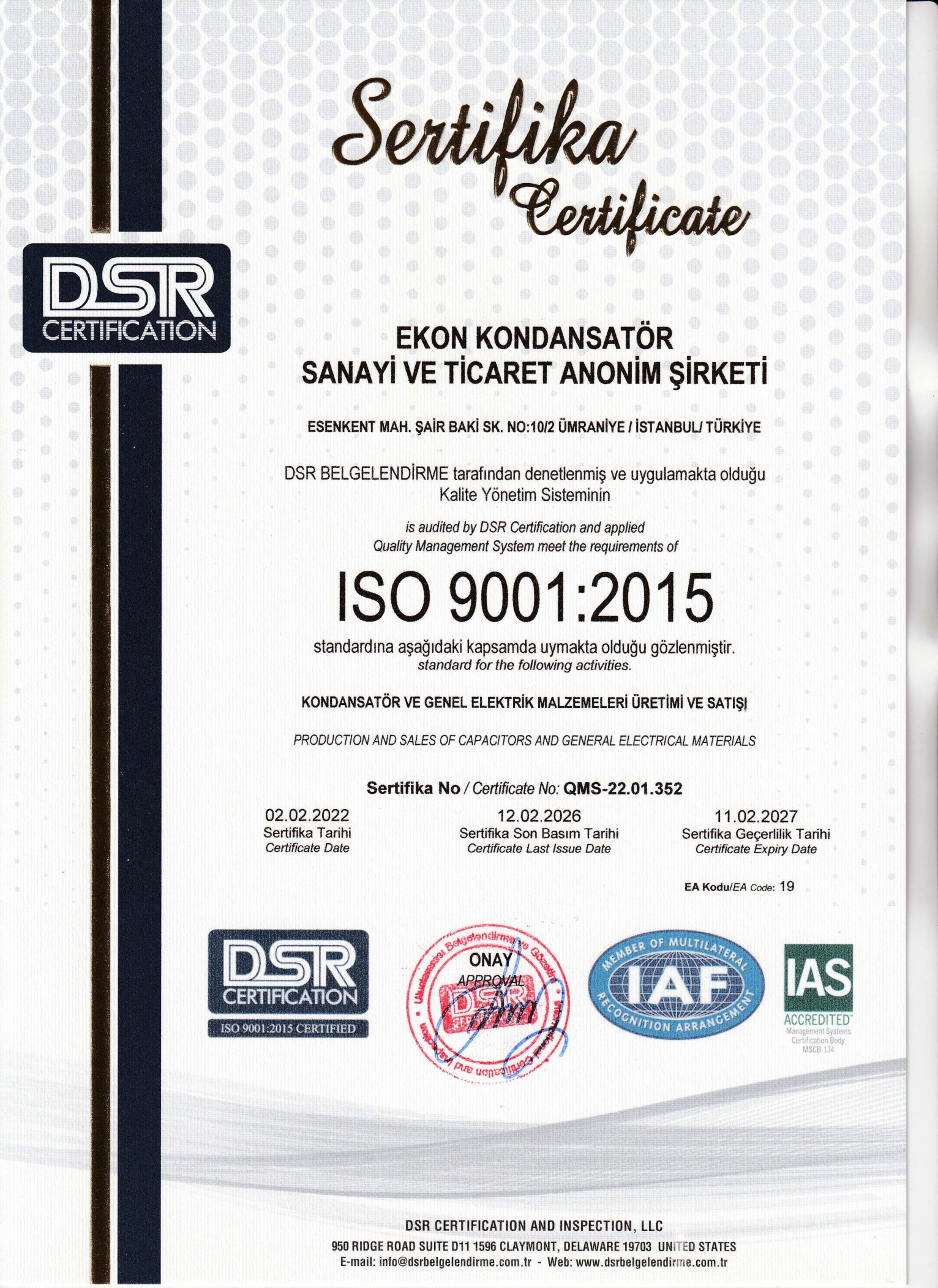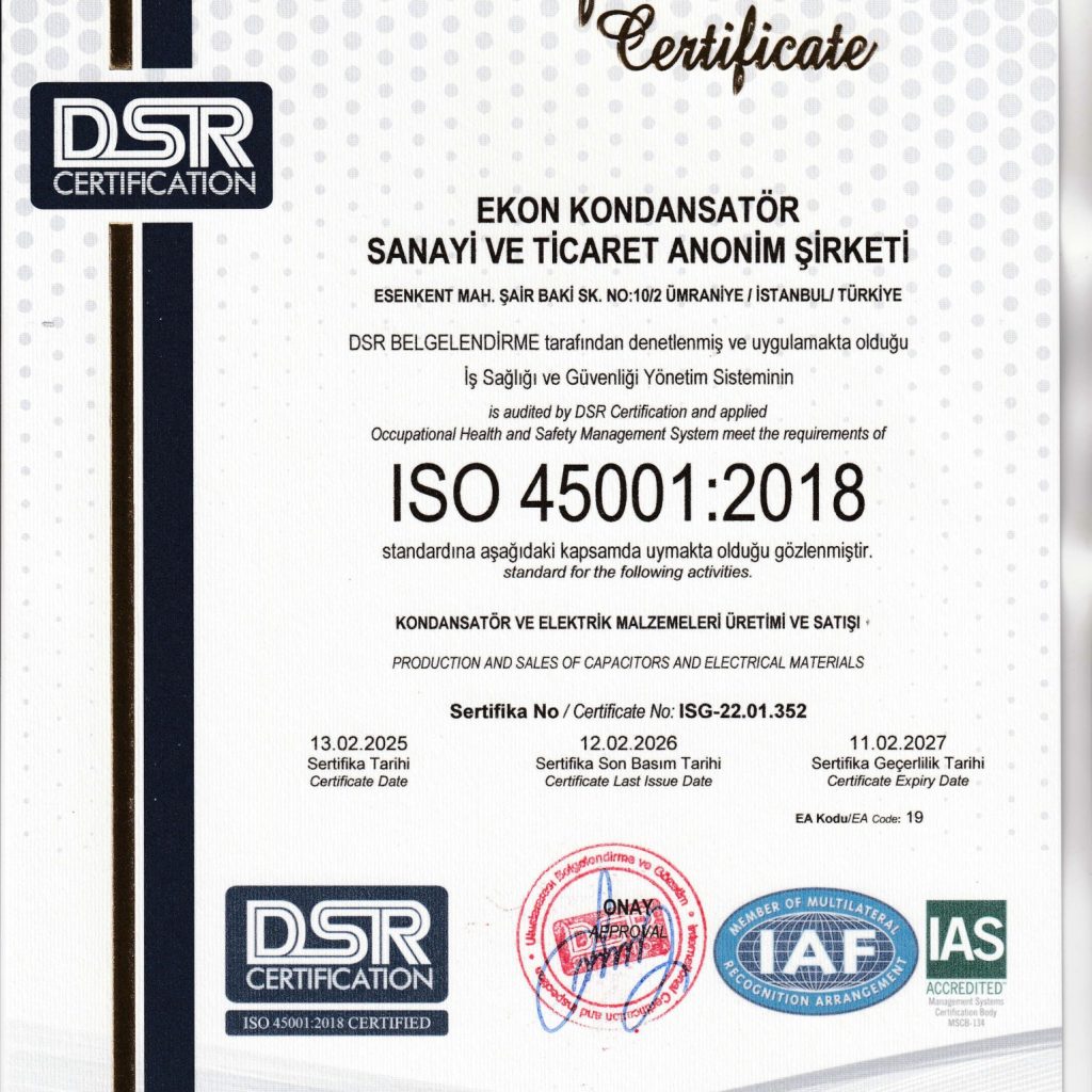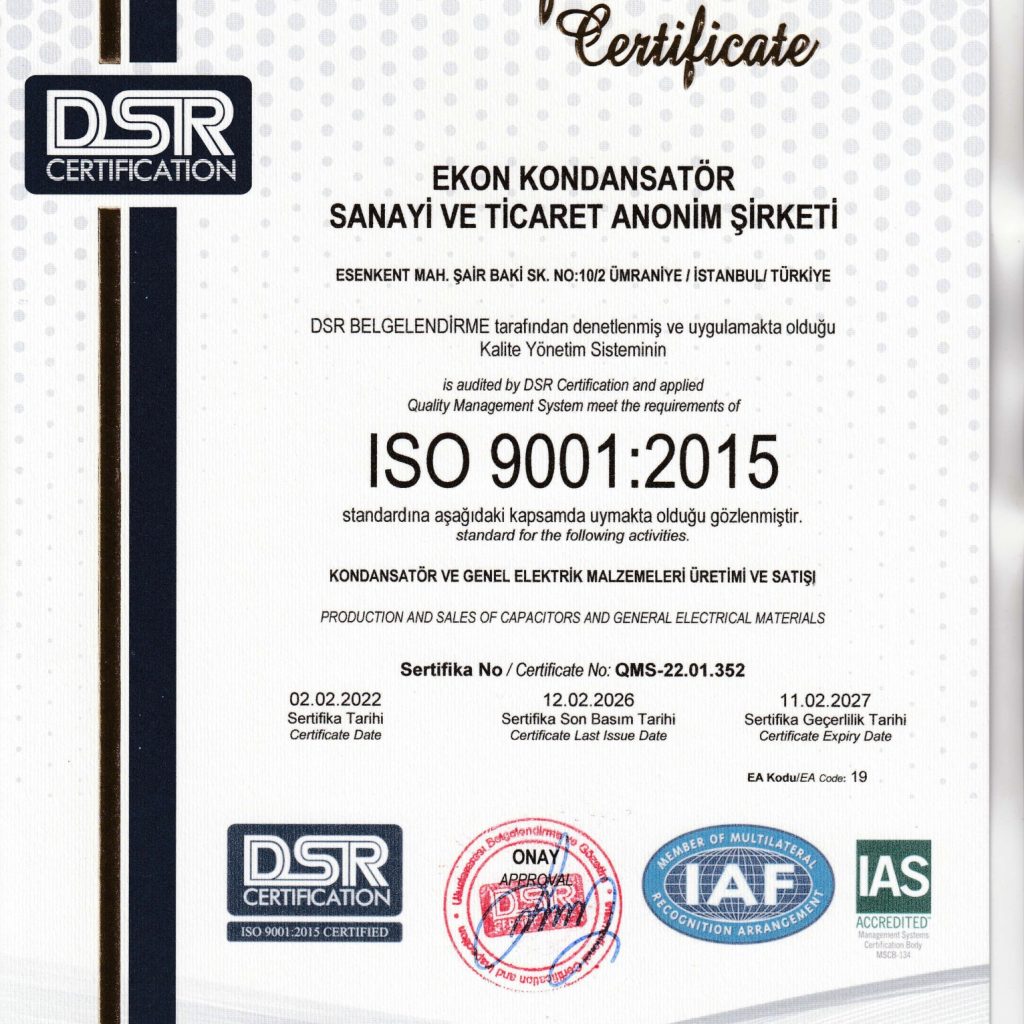 Alçak gerilim güç kondansatörlerinin (TSE EN 60831-1) yanında Türkiye’nin gün itibari ile aydınlatma kondansatörü (TSE EN 61048) ve motor kondansatörü (TS EN 60252-1) tek standart belgeli üretici firmasıdır.